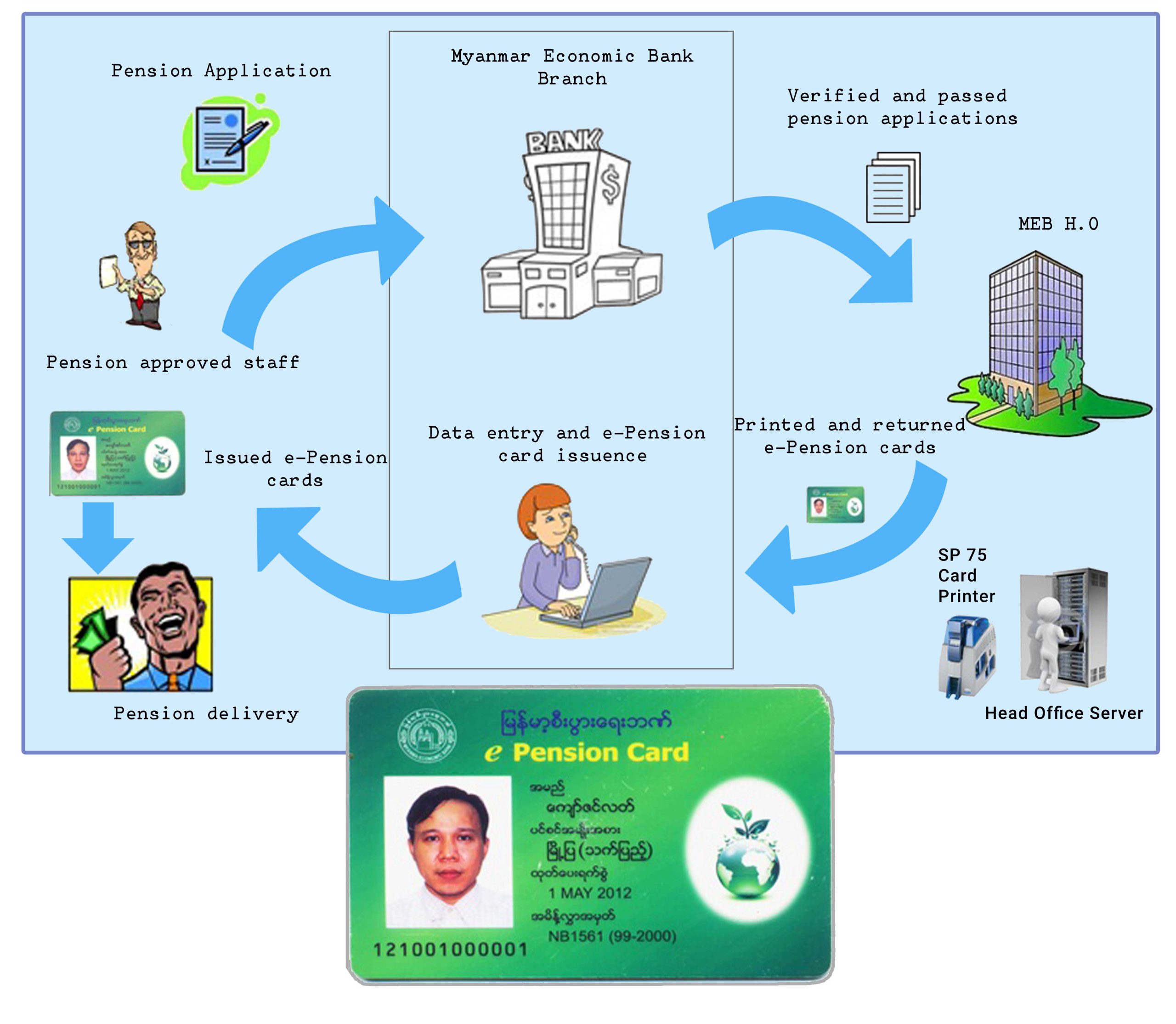 System Brief – Pension approved staff applied for pension at MEB Branches. MEB branches passed personal data to MEB Head Office. MEB H.Q verified, recorded and printed e-Pension card. MEB H.Q issued e-Pension cards to the pensioners through respective MEB branch. MEB branches delivered pension benefit monthly to the pensioners using e-Pension cards and recorded issues. MEB h.Q operated data backup, transfer data copy to a requested branch and re-issued lost or damage cards